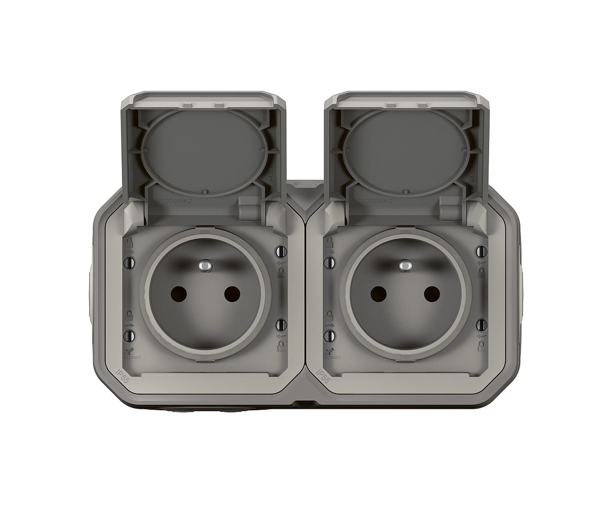 Double prise de courant horizontale avec volet Plexo complet saillie - gris