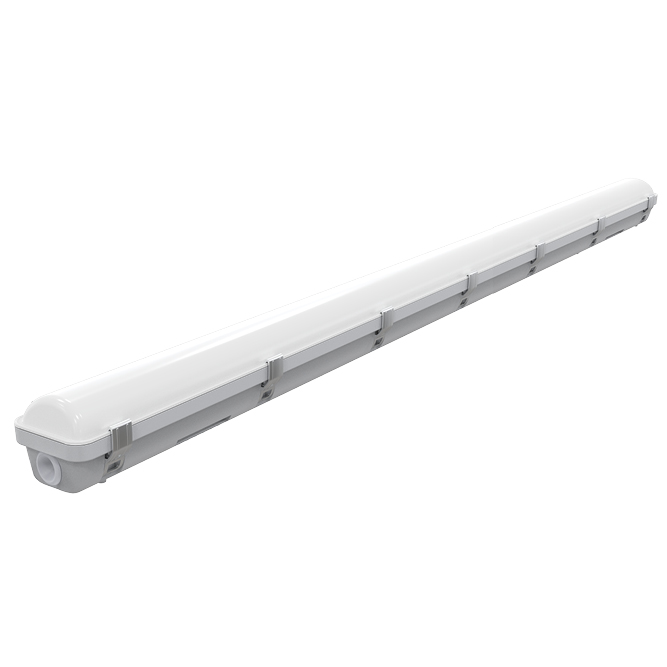 Luminaire LED étanche HWDP Advanced avec power switch 25-30-36-40W et CCT switch 3000-4000-6000K, longueur de 150cm, IP66 en polycarbonate avec couvercle opale IK10 et clips en acier inoxydable. Équipé d'un connecteur de connexion sans outi